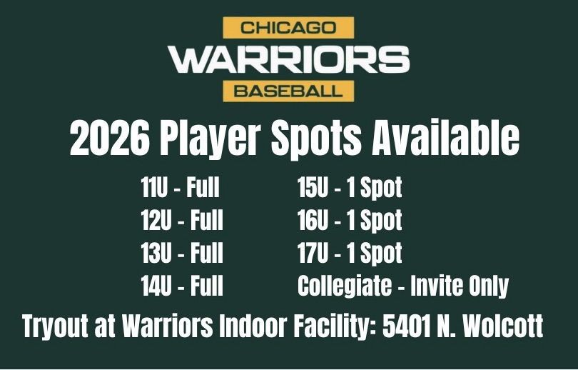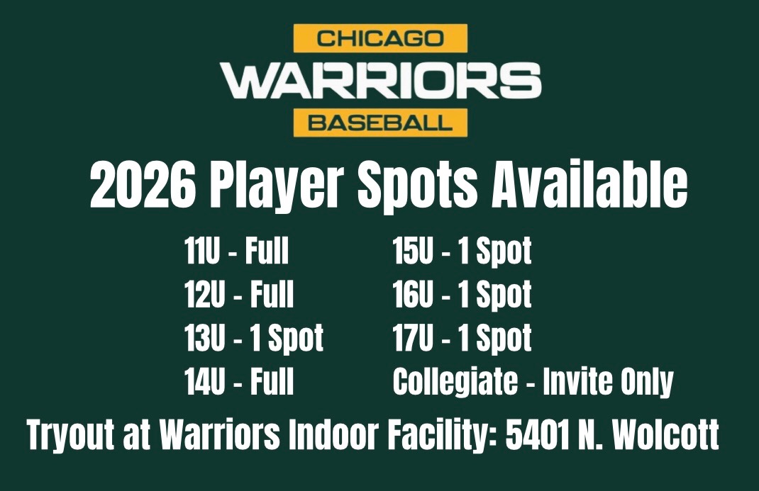Most of all, the Chicago Warriors Baseball is right-sized: big enough to have access to quality coaches, facilities and playing opportunities, while small enough to really get to know all of our players and develop them. Most programs and high school teams are simply picking winners. We develop players, build skills and baseball athleticism.